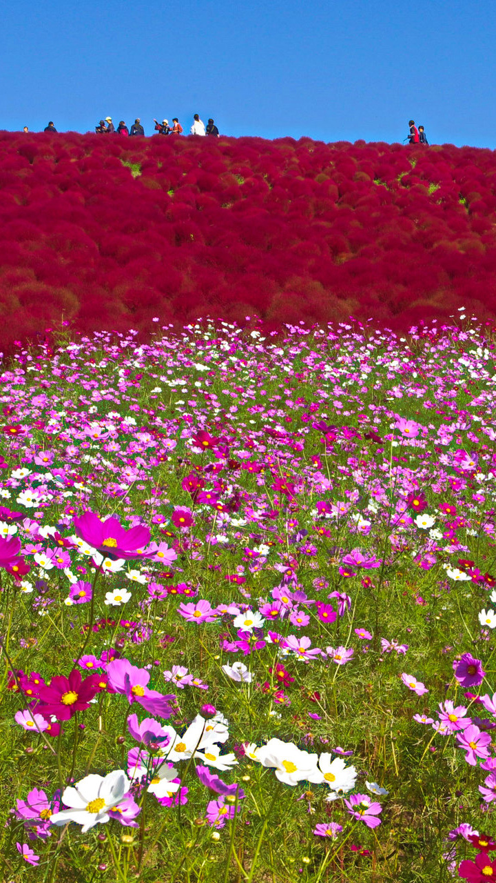 コスモスとコキアと秋空