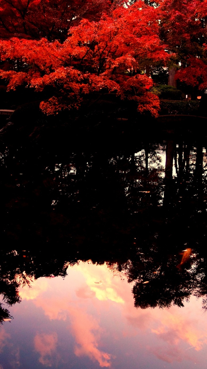 紅葉と夕焼けの映り込み
